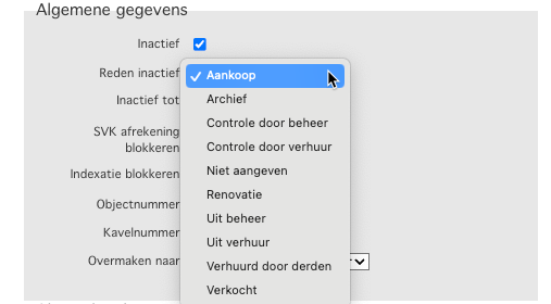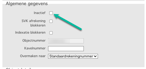 - Vink op de objectpagina in het kader "Algemene gegevens" de checkbox "inactief" aan.