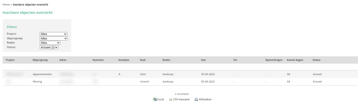 Ga via "Overzichten-> Leegstand -> Status inactieve objecten" naar het "Inactieve objecten overzicht" voor inzicht in alle objecten die op inactief staan.