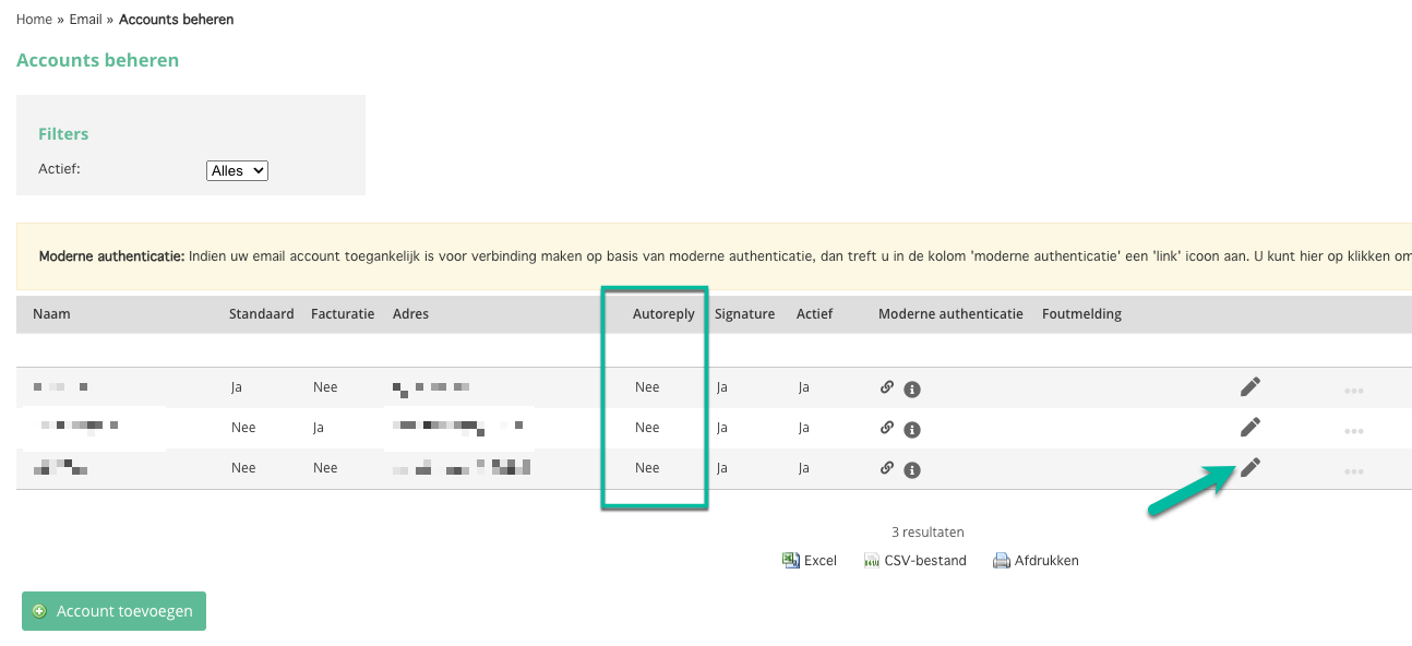Klik om een automatisch antwoord in te stellen op het potloodje. De pagina "Email > Accounts beheren > Bewerken/toevoegen opent.