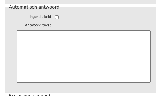 In het kader "Automatisch antwoord" kan aangevinkt worden of de functionaliteit geactiveerd moet worden en kan in het venster "Antwoord tekst" de reactie worden ingevoerd.