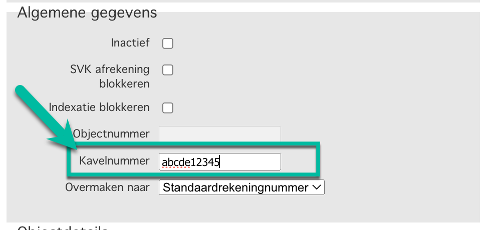 Ga hiervoor naar het betreffende object. In het kader "algemene gegevens" staat tussen "objectnummer" en "overmaken naar" een extra veld opgenomen.