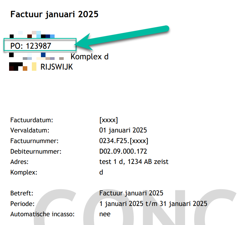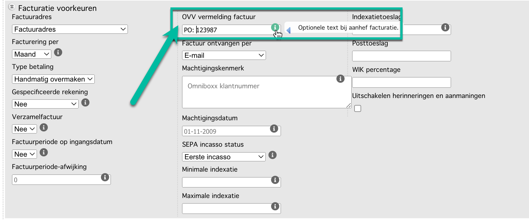 Hiervoor is het onder vermelding van veld op de huurderspagina bedoeld. Ga hiervoor naar de betreffende huurder en klik op het potloodje om de gegevens te bewerken. In het tabblad "betalingsgegevens en facturatievoorkeuren" (commerciele huurder) of "facturatie voorkeuren" (particuliere huurder) staat een veld genaamd "onder vermelding van". Vul hier de gegevens in, zoals bijvoorbeeld PO: 123987:
