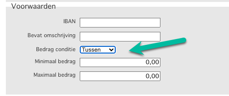 Bedrag conditie: Hier kan een keuze gemaakt worden tussen een "vast" bedrag, kies is in dat geval voor "gelijk aan" en vul het exacte bedrag in bij "Match bedrag".
