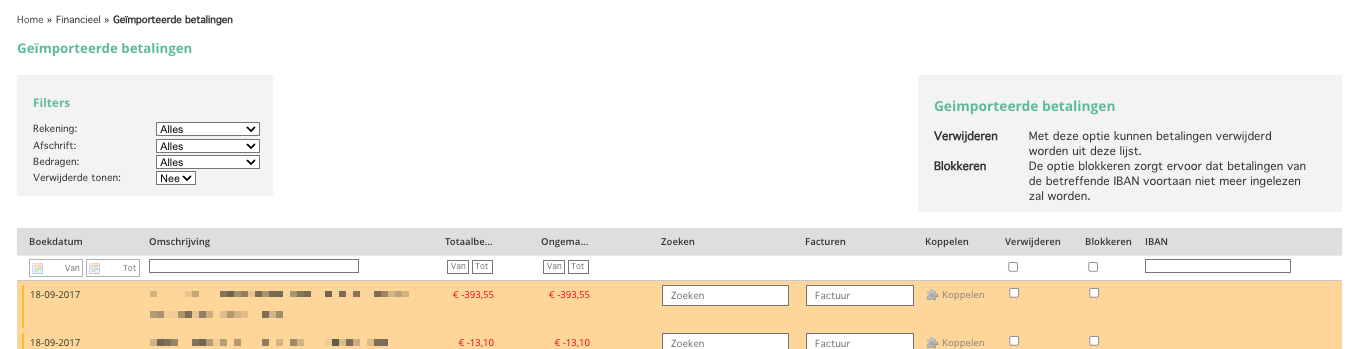 Betalingen die niet automatisch door het systeem aan een openstaande factuur gematcht kunnen worden, blijven zichtbaar in het overzicht "geïmporteerde betalingen" weergegeven.