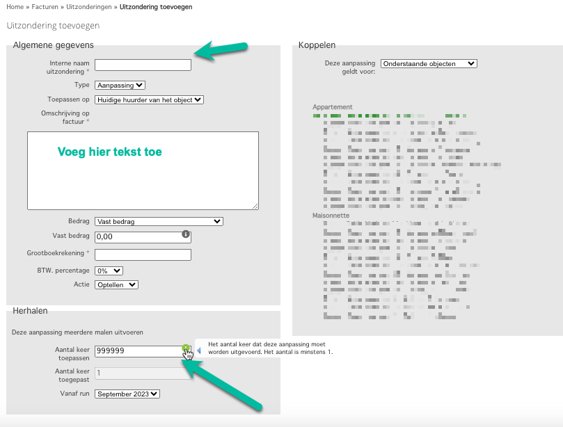 Geef de uitzondering een naam, selecteer het type (bv opmerking), voeg de opmerking toe en vul bij "aantal keer toepassen" een groot getal in om er voor te zorgen dat dit op alle toekomstige facturen wordt toegepast.