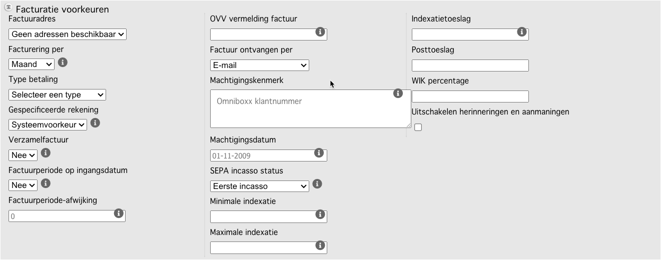 Machtigingskenmerk: Voer het kenmerk van de incasso machtiging van de huurder in. Indien leeg dan zal standaard het Omniboxx klantnummer gebruikt worden.