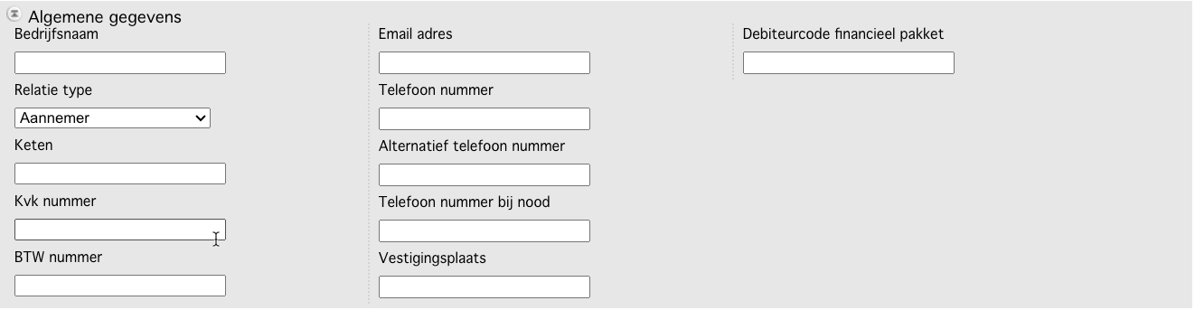 Debiteurcode financieel pakket: Vul hier (indien al bekend, anders kan dit achteraf nog worden ingevuld) de debiteurcode van het financiele pakket toe. Mits gebruik gemaakt wordt van de functionaliteit koppelen met een financieel pakket.