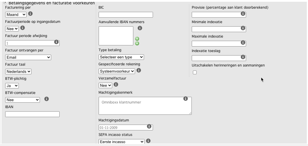 Machtigingskenmerk: Voer het kenmerk van de incasso machtiging van de huurder in. Indien leeg dan zal standaard het Omniboxx klantnummer gebruikt worden.