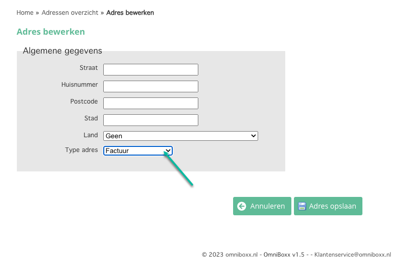 Vul alle adresgegevens in en kies bij "type adres" voor "factuur" en sla het adres op.