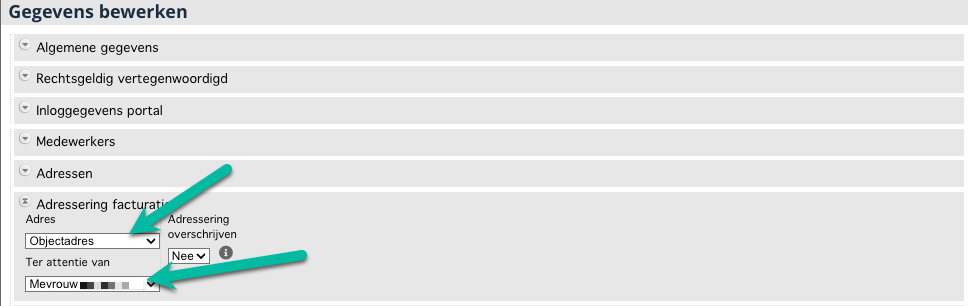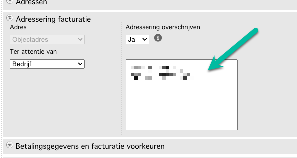 Het is ook mogelijk om de totale adressering te overschrijven. Kies in dat geval voor "ja" voor de instelling "adressering overschrijven" op het tabblad "adressering facturatie".
