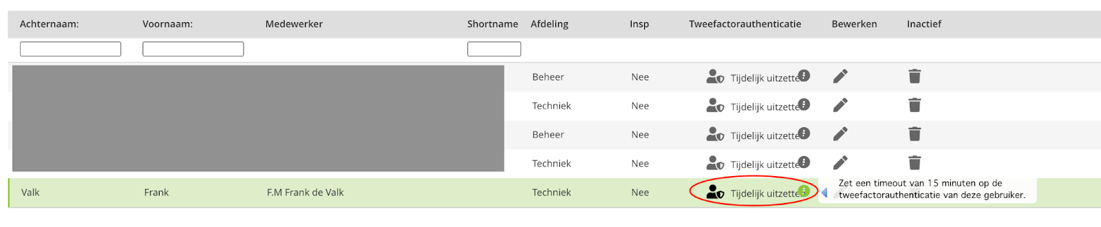 - Alleen een gebruiker met administrator rechten ziet de knoppen "tijdelijk uitschakelen" en kan deze aanklikken, waardoor de 2FA tijdelijk wordt uitgeschakeld.