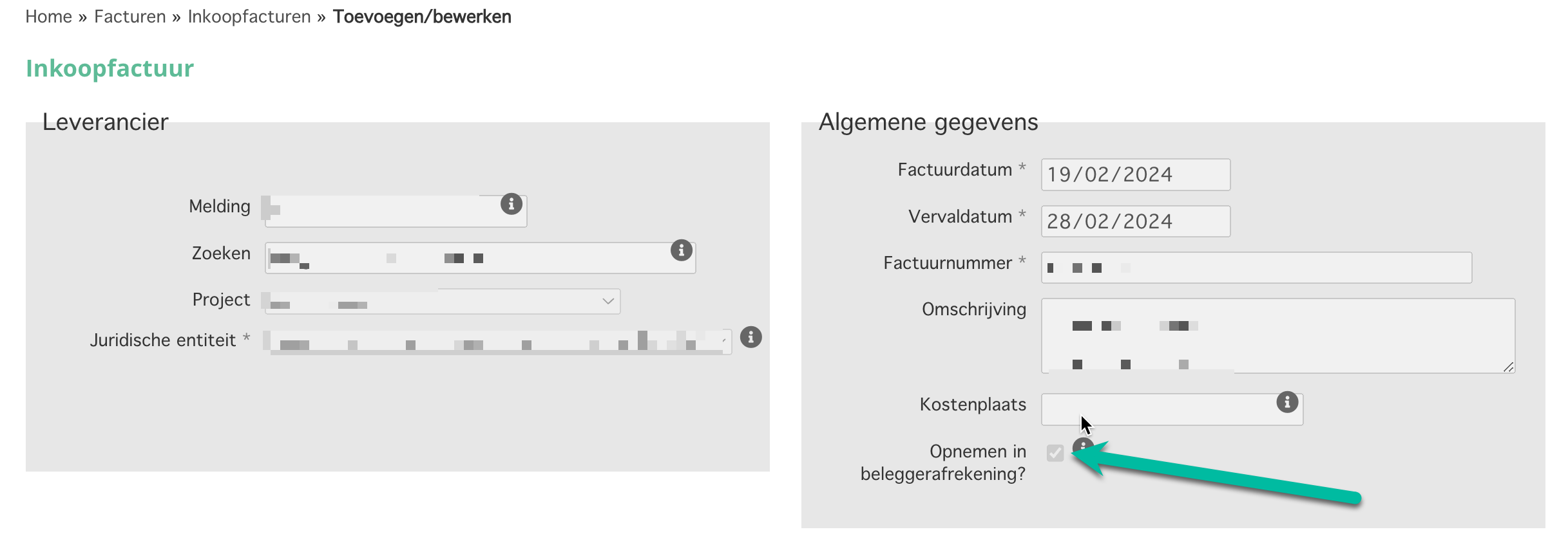 Wanneer een inkoop factuur in een beleggerafrekening moet worden verwerkt, moet deze factuur aan een aantal voorwaarden voldoen. Daarnaast dienen er ook een aantal instellingen op de beleggerspagina correct te zijn ingevoerd om ervoor te zorgen dat facturen automatisch op de afrekening worden opgenomen.