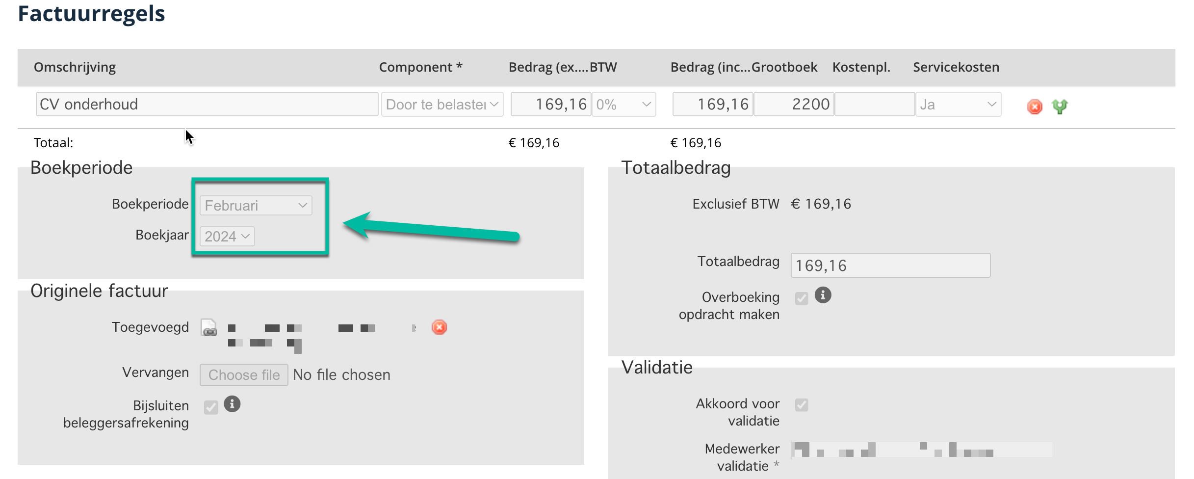 De boekperiode is niet goed ingevuld. Als de boekperiode in het verleden ligt, en de afrekening van die periode is al verzonden, dan wordt de inkoopfactuur niet meer opgenomen in de afrekening. Ligt de boekperiode in de toekomst, dan zullen de kosten op de afrekening van de gekozen periode worden opgenomen.