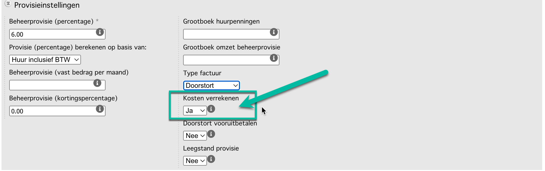 Ga naar de belegger klik op het potloodje achter de naam van de belegger om de gegevens in te zien. Onder het tabblad "provisieinstellingen" staat een veld "kosten verrekenen".