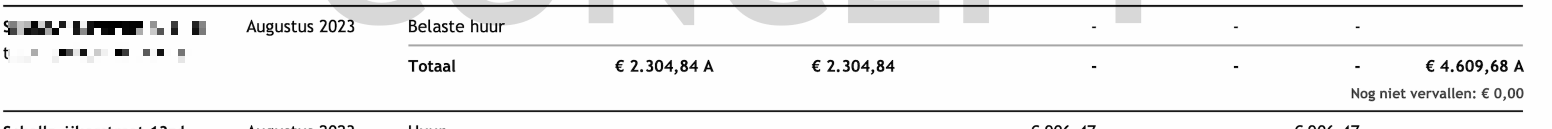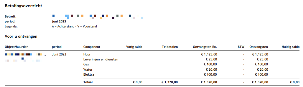 Op de beleggerafrekening wordt op het betalingsoverzicht per object (huurder) het "Huidig saldo" weergegeven in de laatste kolom.