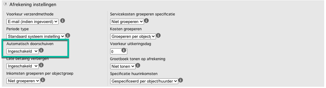 Als een (handmatige) factuur van een vorige boekperiode wordt betaald (of op betaald wordt gezet) én "automatisch doorschuiven" staat niet aan bij de "afrekening instellingen" van de belegger, wordt de betaling niet doorgeschoven naar de afrekening van de volgende periode. Ook als vervolgens (achteraf) doorschuiven wordt aangezet, wordt dit niet met terugwerkende kracht aangepast.