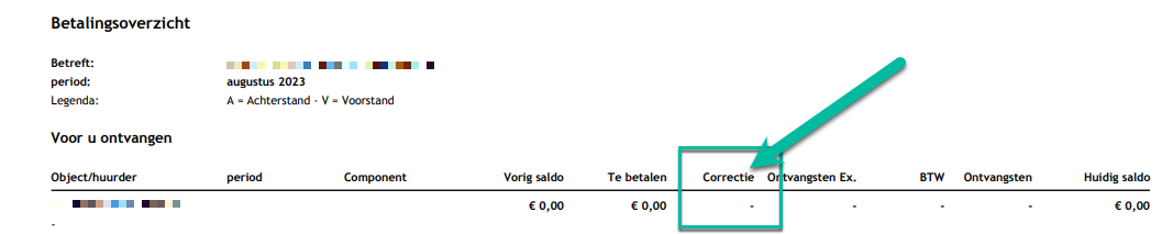 Het kan voorkomen dat er een kolom "correctie" staat opgenomen op het betalingsoverzicht.