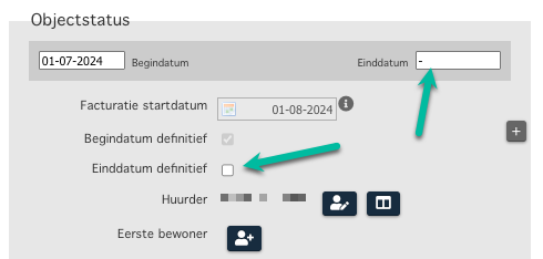 Als bekend is of wordt dat een huurcontract afloopt kan de einddatum van de huurder op de objectpagina bij de objectstatus worden ingevoerd. Wanneer dit is gebeurd komt op de huurderspagina de functionaliteit "aanmaken laatste nota" beschikbaar.