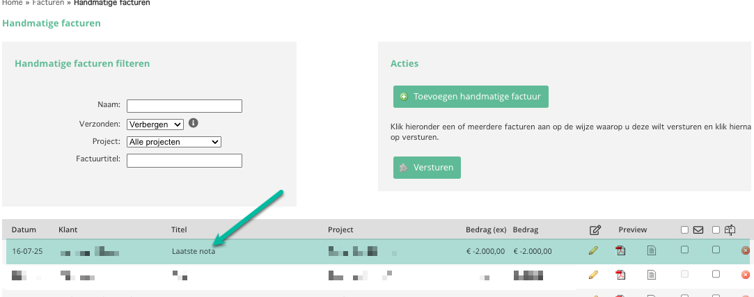 Na het aanklikken van "laatste nota maken" opent Omniboxx het overzicht handmatige facturen. Hier staat de laatste nota klaar ter controle.