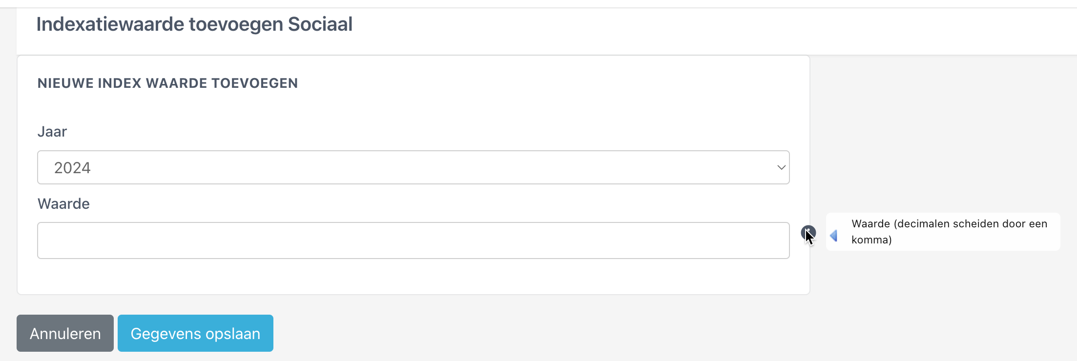 In het indexatietypen overzicht staat een kolom "Waardes". Door te klikken op het icoon in deze kolom opent een veld waar de waardes voor de betreffende indexatie type moeten worden ingevoerd.