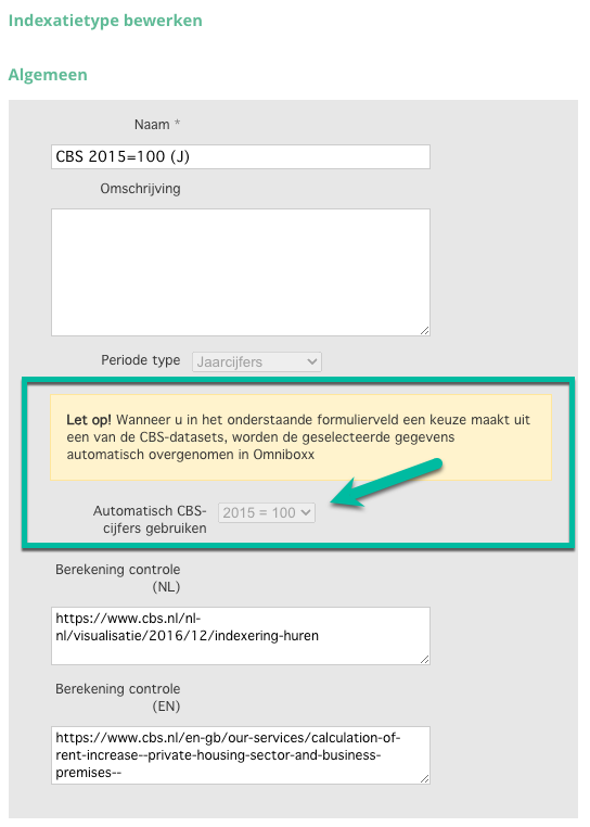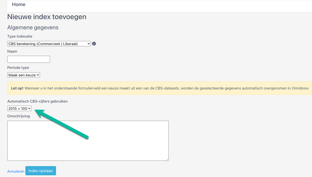 Het aanmaken van een nieuw indexatietype staat beschreven in de handleiding "Instellen indexatietypen". Als een indexatietype voor CBS index 2015 = 100 wordt aangemaakt is het mogelijk om de waardes geautomatiseerd te importeren. Kies dan in het veld "automatisch CBS-cijfers gebruikt" voor 2015 = 100.