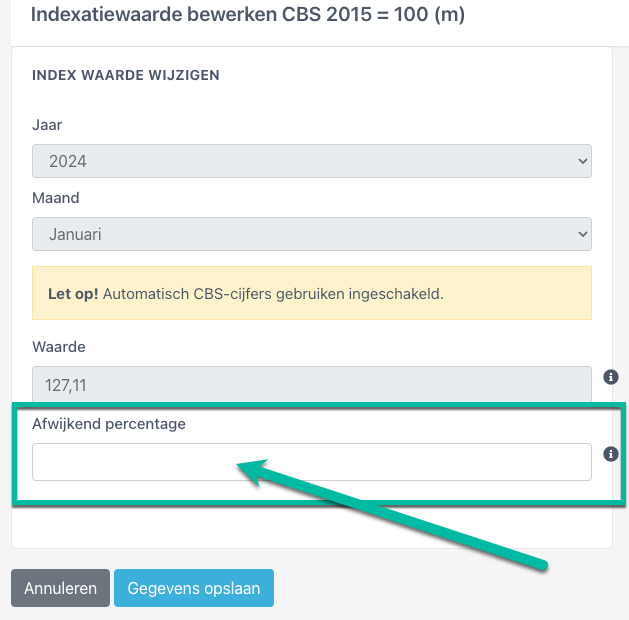 Het afwijkende percentage overschrijft de CBS waarde. (Dit kan zowel bij jaar- als bij maandindexatie waarden)