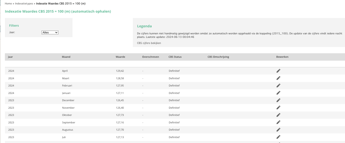 Bij nieuwe klanten staan in de omgeving altijd enkele als voorbeeld indexatietypen klaar. Vanaf begin 2024 staat voor het indexatie type CBS 2015=100 het automatisch ophalen van de CBS cijfers daar standaard ingesteld.