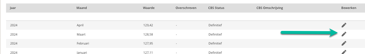 Klik op het potloodje in de kolom bewerken voor het aanpassen van een bestaand type CBS 2015=100 (J) of CBS 2015=100 (Maand).