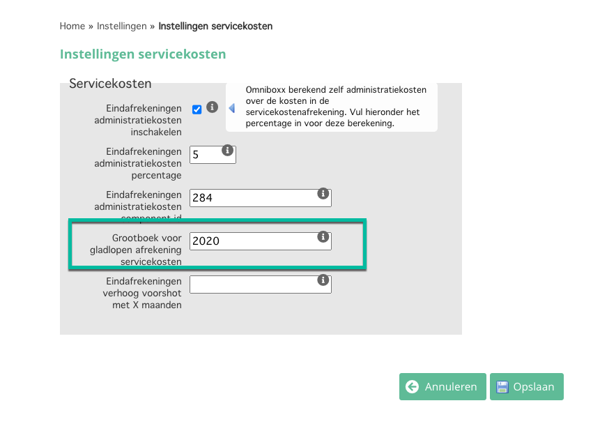 1. Instelling "grootboek voor gladlopen afrekening servicekosten"