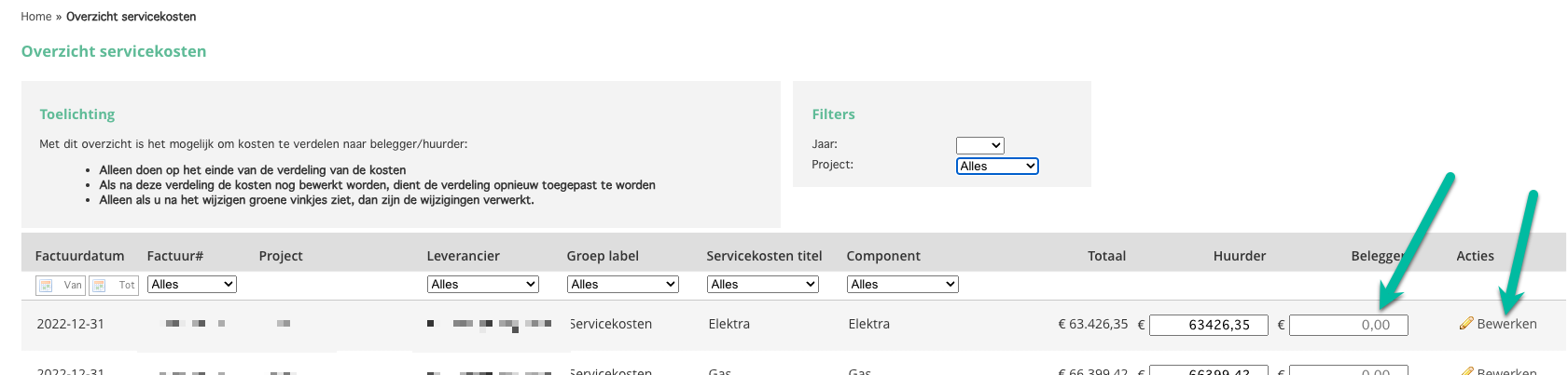 Ook is het mogelijk om in dit overzicht een deel van de kosten toe te kennen aan de eigenaar/belegger. Vul hiervoor een deel van het totaal in in het veld in de kolom belegger.