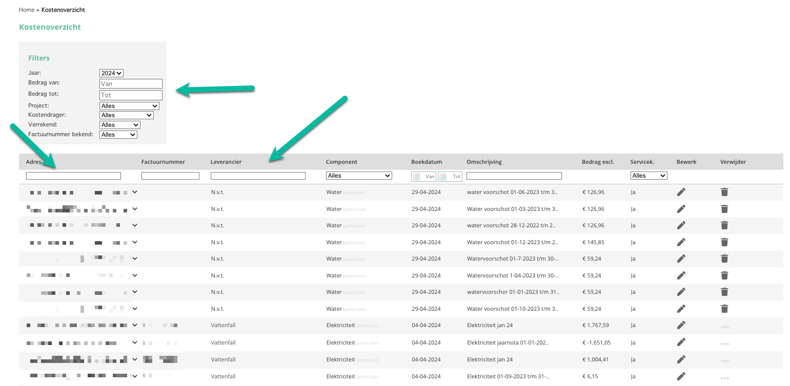 Zoek de betreffende kosten op in het kostenoverzicht en maak daarbij gebruik van de diverse mogelijkheden om het overzicht te filteren: