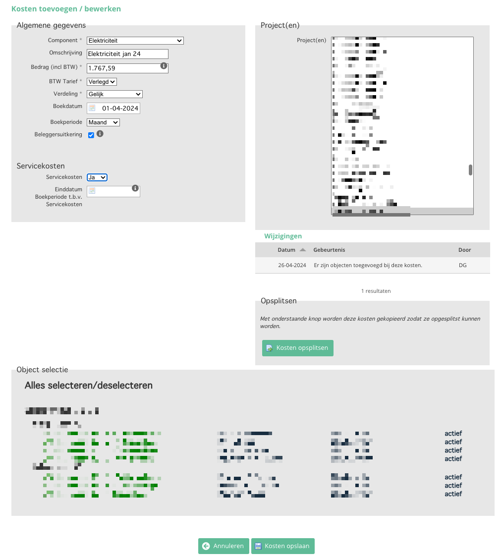 Klik op het potloodje achteraan in de kostenregel om de kosten te bewerken. Boekperiode, componenten en verdeling over objecten e.d. kunnen achteraf probleemloos worden aangepast, mits de servicekosten eindafrekening over de periode nog niet definitief is.