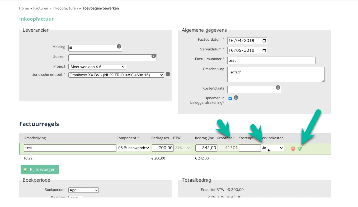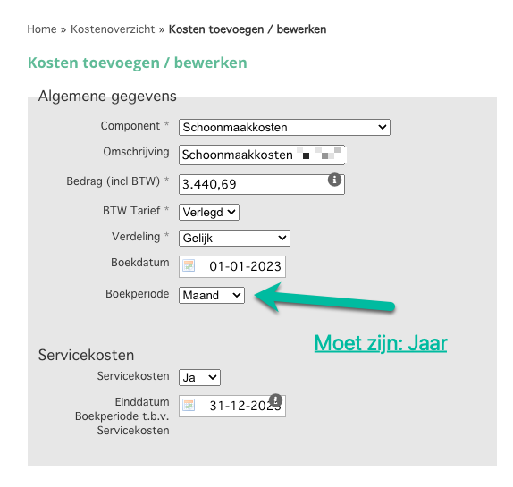 Let op: Controleer goed of de juiste boekperiode staat ingesteld op de factuur in Omniboxx. Bijvoorbeeld: kosten voor glasbewassing kunnen in maart worden gefactureerd voor het gehele jaar. Stel hier dan “boekjaar” en het betreffende jaar in voor een juiste verdeling in de servicekosten eindafrekening. |