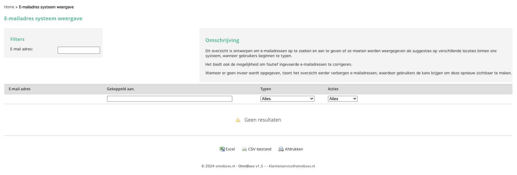 Voor het beheren van de weergave van de suggesties is er een functionaliteit in Omniboxx beschikbaar, een overzicht waarin e-mailadressen gezocht kunnen worden en aangegeven kan worden of ze als suggestie moeten worden weergegeven. Het overzicht biedt ook de mogelijkheid om foutief ingevoerde e-mailadressen te corrigeren.