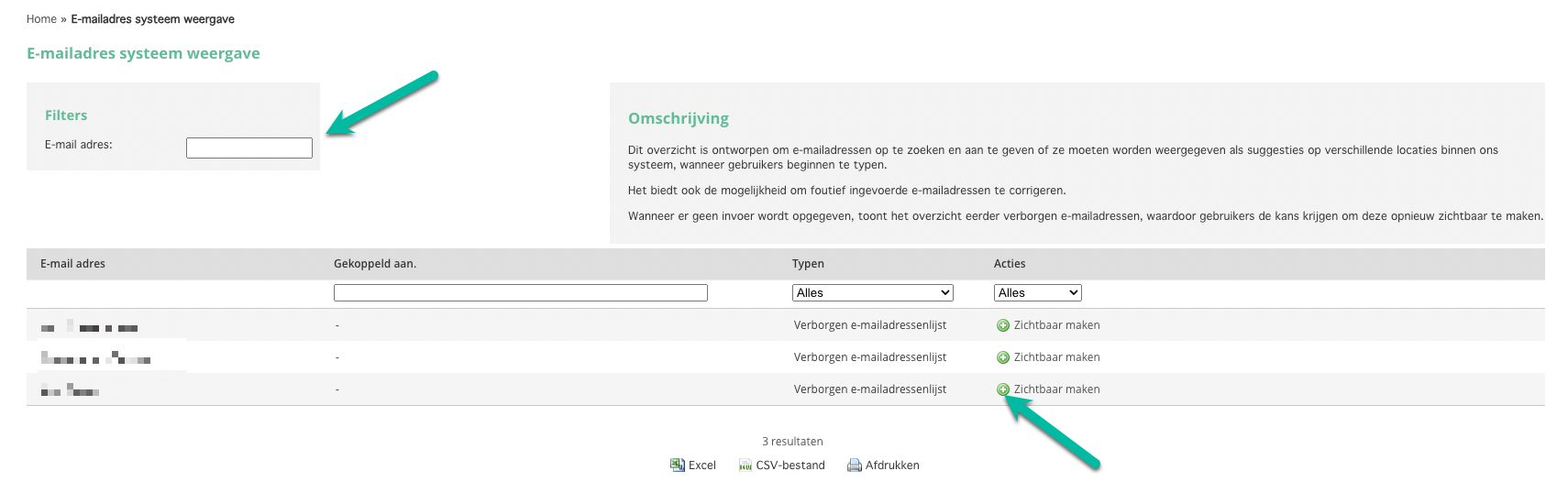 Alle eerder verborgen e-mailadressen zijn zichtbaar en door te klikken op "zichtbaar maken" zal het betreffende e-mailadres weer zichtbaar worden in de adressuggesties bij het maken van een e-mail.