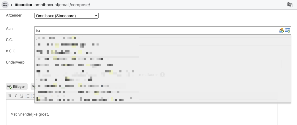 Bij het maken van een e-mail geeft Omniboxx suggesties voor de e-mailadressen zodra (een deel van) het e-mailadres wordt ingevuld in het adres-venster.