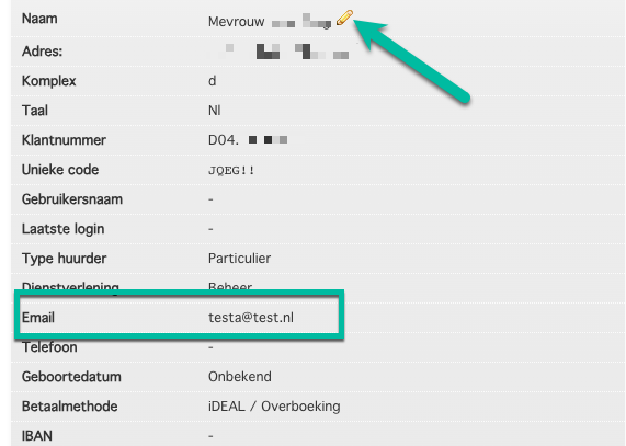 In het overzicht staat in de tweede kolom aangegeven waar het e-mailadres aan gekoppeld is. Indien dit een huurder, company of interne gebruiker is kan, door middel van het aanklikken van de naam, de relatie-pagina geopend worden. Hier kan vervolgens het foutief ingevoerde e-mail adres gecorrigeerd worden doormiddel van het bewerken van de relatie door op het potloodje te klikken.