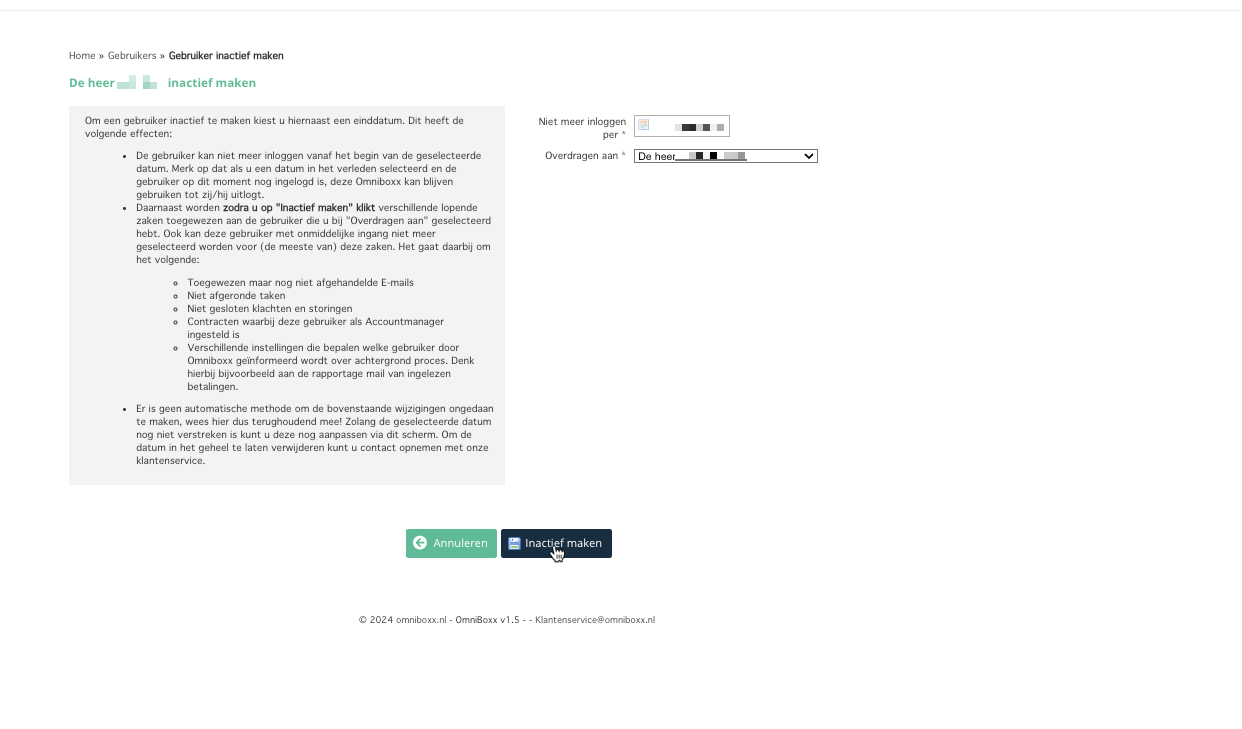 Let op: Terugdraaien van een inactief gemaakte gebruiker kan alleen door Omniboxx Techniek worden uitgevoerd. Hier zullen kosten voor in rekening gebracht worden. |