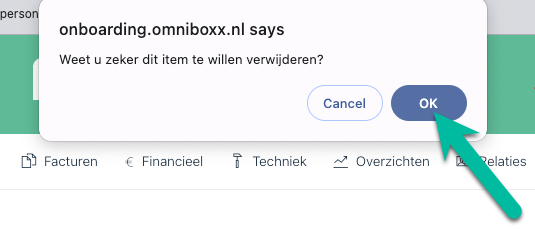 Ondanks dat in de pop-up de vraag wordt gesteld of "het item verwijderd" moet worden, zal Omniboxx de gebruiker niet verwijderen, maar archiveren.