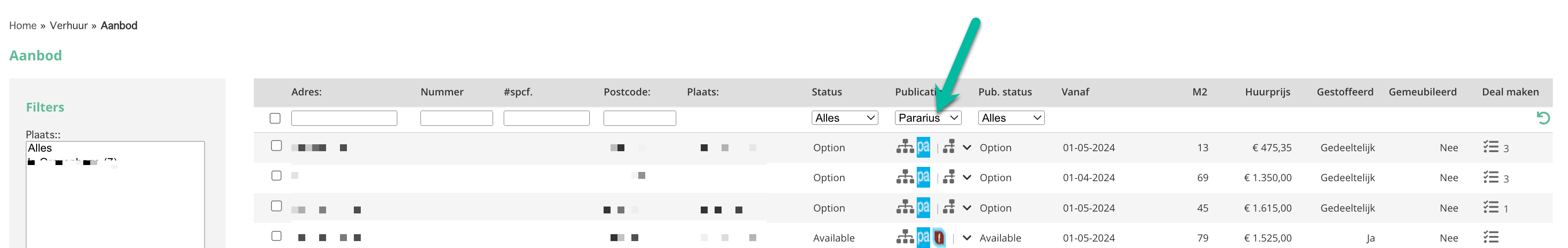 Via "Verhuur -> aanbod" en filter op Pararius komt er een lijst zichtbaar waarin alle te controleren objecten staan.