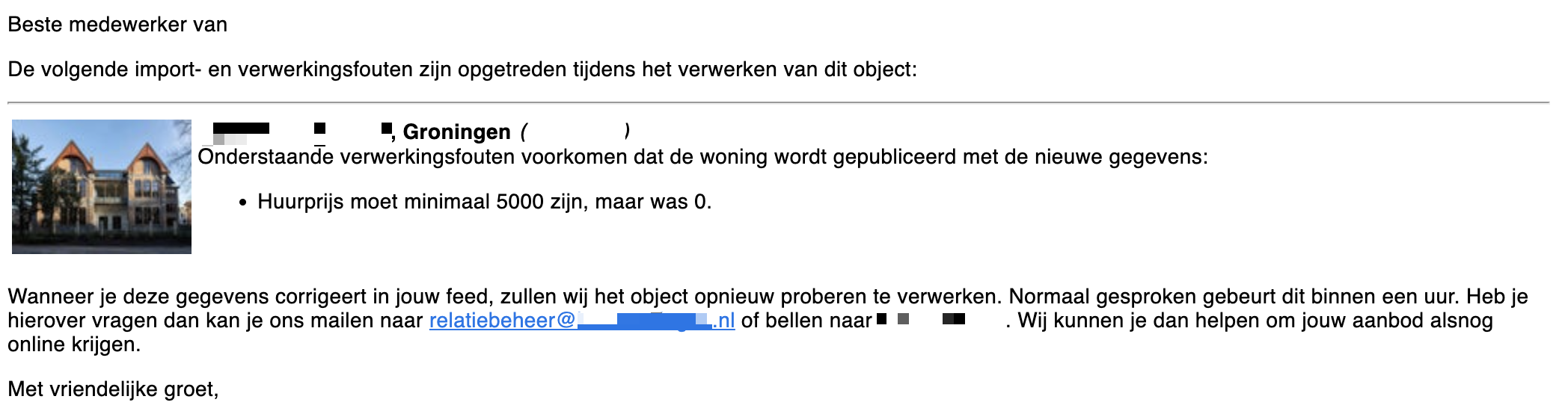 - [adres] kon niet worden gepubliceerd: e-mail wordt direct door Pararius verstuurd wanneer er een nieuwe woning met fouten wordt aangeboden aan Pararius (uitwisseling vindt 1 keer per uur plaats)
