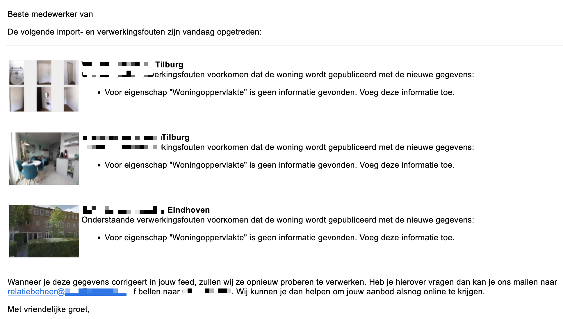- import- en verwerkingsfouten: e-mails worden dagelijks 's ochtends verstuurd door Pararius naar de verhuurmakelaar met een overzicht van alle niet verwerkte woningen