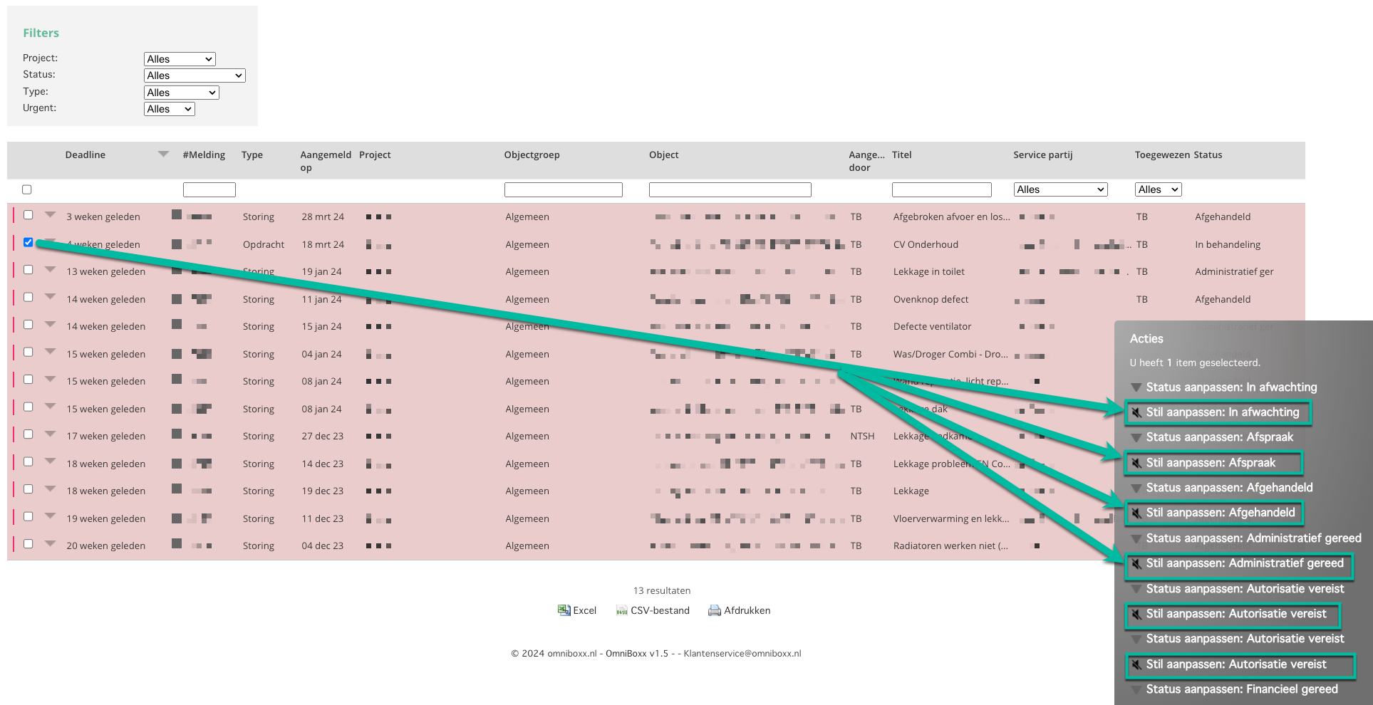 Standaard staat de functie om voor meldingen de statussen in bulk aan te passen voor alle Omniboxx-omgevingen niet ingeschakeld. Als er behoefte is om deze functie in te schakelen kan de klantenservice hierbij van dienst zijn.