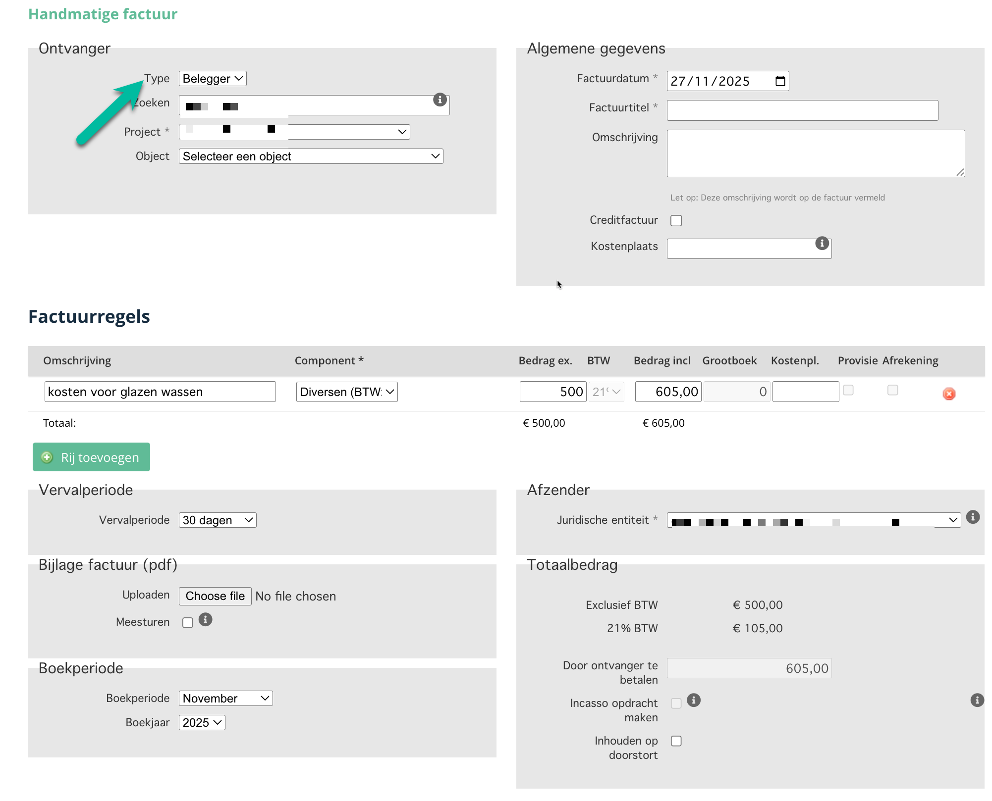 Maak conform bovenstaande handleiding een handmatige factuur voor de belegger voor de te verrekenen kosten en kies voor "type" belegger.