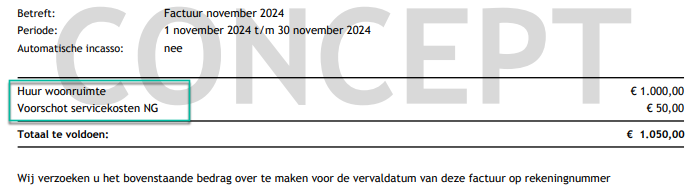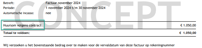 Dit betekent dat een gespecificeerde factuur wordt opgesteld waarop alle componenten van de huuropbouw op de factuur staan opgenomen óf een factuur waar alleen de opname van 1 regel "huursom volgens contract op de factuur" staat.
